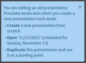 Press the bolded Duplicate button. This will duplicate the presentation and automatically schedule it for the coming Sunday.